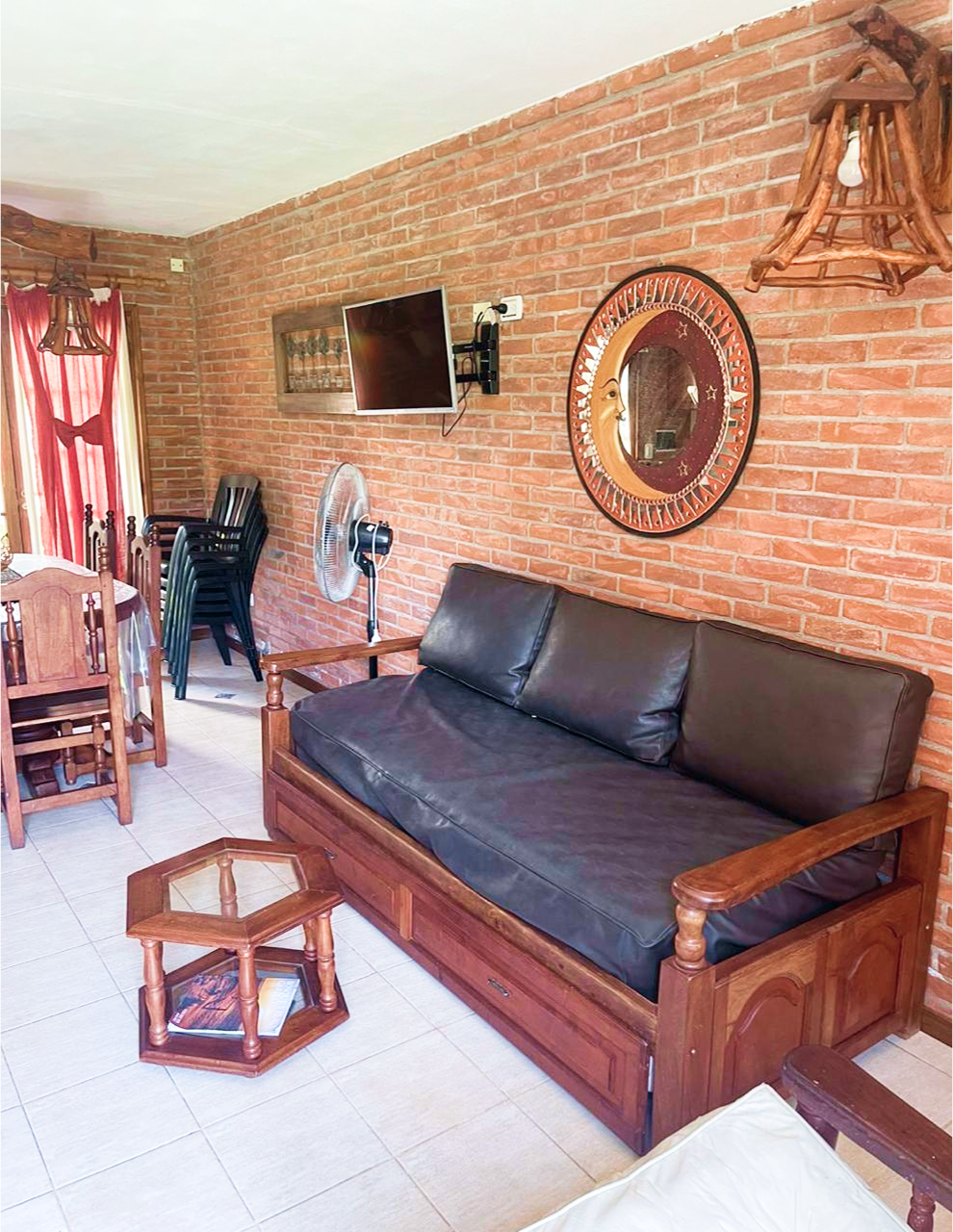 Hogar a leños, cocina con horno y extractor, microondas, heladera con freezer.